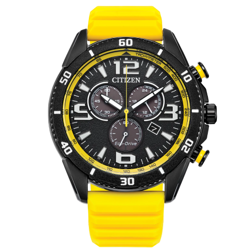 On the dial, the sporty styling continues, with lume-filled, highly legible hour markers anchoring the look, while a yellow tachymetric scale outlines the display. Advanced functions include a 1-second chronograph measuring up to 60 minutes, 12/24 hour time, and a date indicator at the 4 o'clock position. The men’s high-performance Brycen is sustainably powered by any light with Citizen's proprietary Eco-Drive technology that never needs a battery. Water resistant up to 100 meters. Caliber H500.