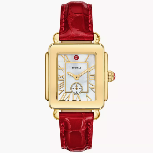 The Deco Mid Sport combines a vibrant ruby red color with refined design. Its 31mm rectangular gold-tone stainless steel case frames a mother-of-pearl white dial, accented with polished roman numeral indexes and a sub-second movement. The shiny, croco-embossed leather strap, is interchangeable with any 16mm strap from MICHELE's collection, adding versatility to the design.