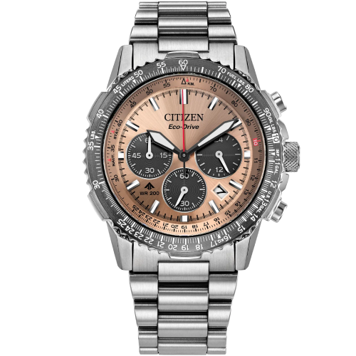 On the dial, a light COPPER colorway with red, black, and white accents adds to the watch's superior legibility, while a sapphire crystal and 200m of water resistance protect it all. Functions include a 1/5 second chronograph measuring up to 60 minutes, 12/24 hour time displays, and a date indicator, all powered by our Eco-Drive technology – sustainably powered by light and never needing a battery. Caliber B620.