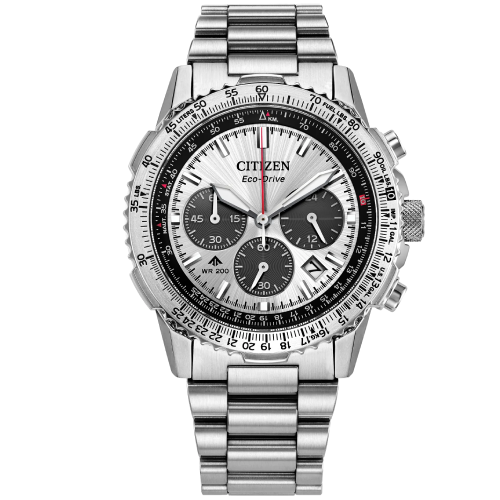 On the dial, a silver-tone colorway with red, black, and white accents adds to the watch's superior legibility, while a sapphire crystal and 200m of water resistance protect it all. Functions include a 1/5 second chronograph measuring up to 60 minutes, 12/24 hour time displays, and a date indicator, all powered by our Eco-Drive technology– sustainably powered by light and never needing a battery. Caliber B620.