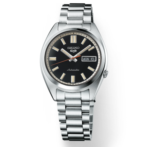 Show your style. Make your move. For over 50 years, Seiko 5 Sports has delivered consistently high levels of reliability, durability, and performance. Inspired by the best-selling SNXS series from the classic Seiko 5 collection of the past, this exceptional watch offers a compact case and bracelet design incorporating iconic elements of the original models with upgraded performance for today. Providing automatic technology that you control with every movement, this dynamic timepiece is powered by a 24-jewel movement that beats at a frequency of 21,600 vibrations per hour, with a power reserve of approximately 41 hours and manual winding capability. Framed by a metallic minute track, the deep black dial features diamond cut indices with grooved top surfaces, a day/date calendar, and LumiBrite coating on the hands and markers for enhanced visibility in low-light conditions. Crafted of stainless steel with hairline and mirror finish, the sharply designed case has a low center of gravity for a comfortable fit and features a screwdown see-through caseback for a view of classic timekeeping in action, flowing seamlessly to a stainless steel bracelet with a tri-fold push button release clasp. 10 bar, 100M Water Resistant